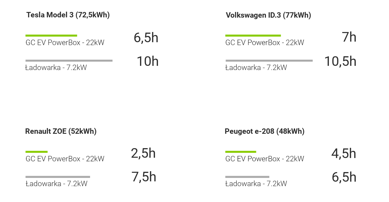 - Neplýtvej časem. Nabíječka GC EV PowerBox umožňuje nabíjet až 22 kW – to je nejvyšší možná hodnota pro nabíjení střídavým proudem. Díky tomu ušetříte až několik hodin!