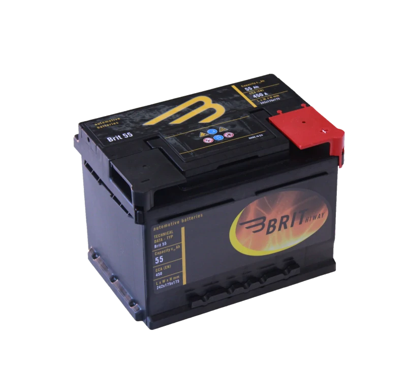 Hledáte autobaterii 55 Ah pro osobní vůz? BRIT Hiway 55Ah 12V se startovacím proudem 450 A (EN) je spolehlivá bezúdržbová olověná baterie pro běžná auta bez Start-Stop. Díky rozměrům 242 × 175 × 175 mm a spodní liště B03 se hodí i do řady asijských modelů.