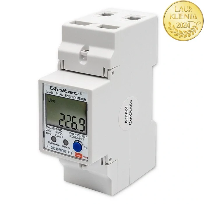 - Qoltec 50882 Jednofázové elektronické počítadlo | měřič spotřeby energie na DIN lištu | Wifi | TUYA | 230V | LCD |