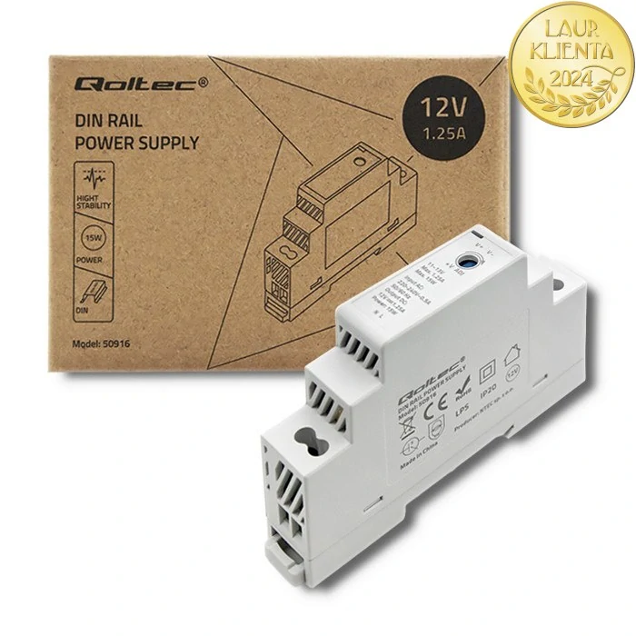 - Qoltec 50916 – Průmyslový napájecí zdroj na DIN lištu 15 W / 12 V / 1,25 A / Šedý
