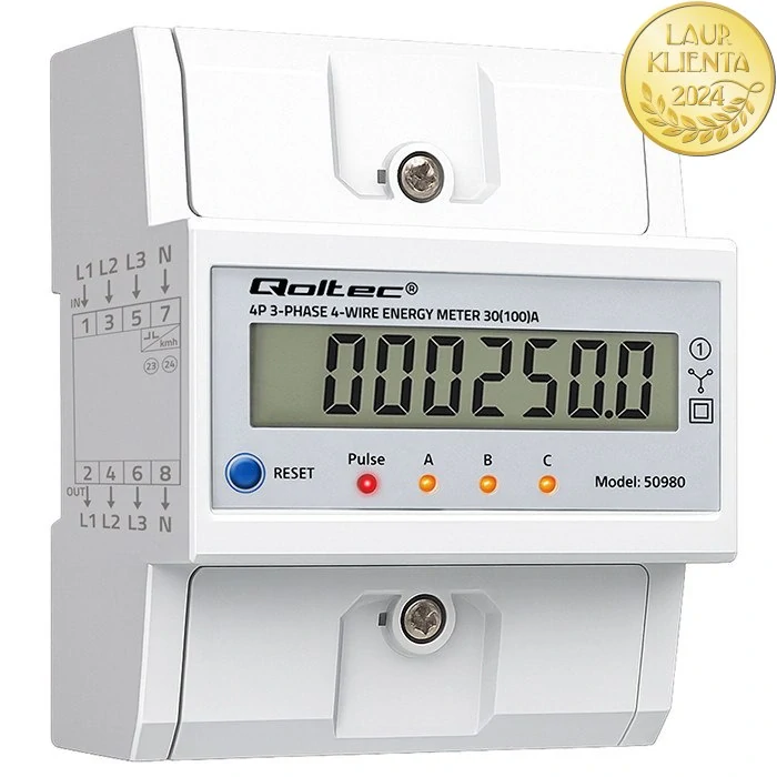 - *Qoltec 50980 Qoltec Třífázový elektronický elektroměr s resetem | Elektroměr na DIN lištu | 400V | 100A | LCD | LED | 4P