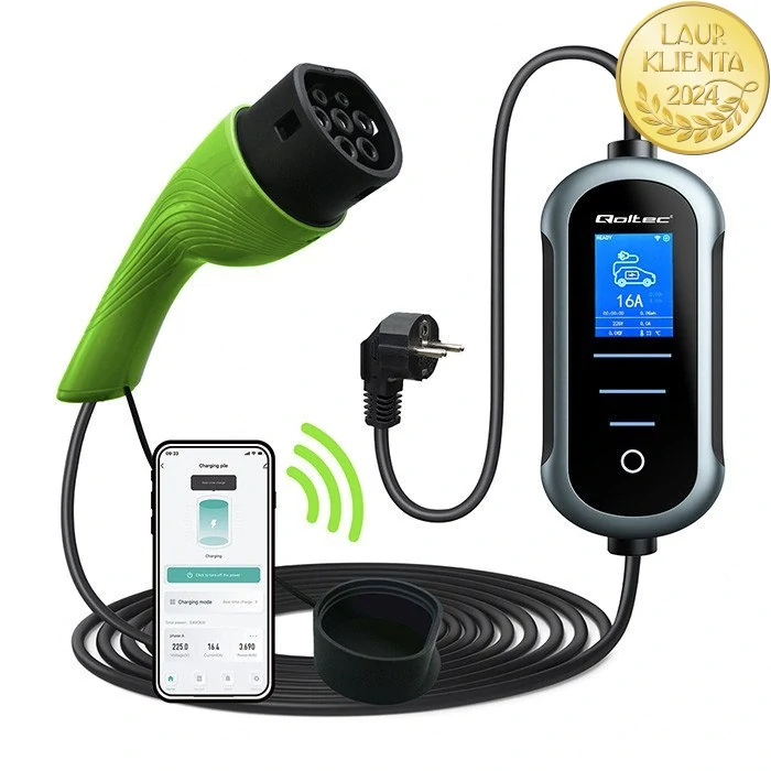 Mobilní nabíječka Qoltec pro elektromobily s konektorem Typ 2 (IEC 62196-2), výkonem až 3,5 kW, nastavitelným proudem 8/10/13/16 A a 5 m kabelem. Napájení ze schuko 230 V, robustní TPU kabel, krytí IP65, přehledný LCD 2,4″ a LED indikace. Wi-Fi (aplikace Tuya/Smart Life) pro vzdálené řízení a plánování nabíjení.